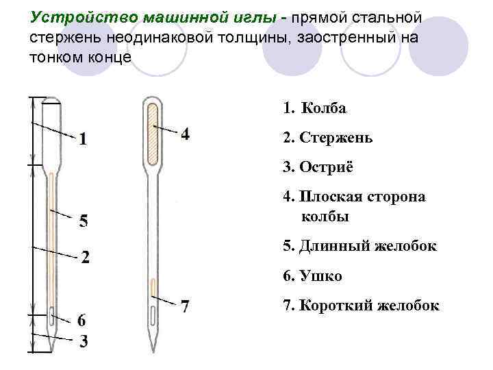 Устройство машинной иглы - прямой стальной стержень неодинаковой толщины, заостренный на тонком конце 1. Колба 2. Стержень 3. Остриё 4. Плоская сторона колбы 5. Длинный желобок 6. Ушко 7. Короткий желобок