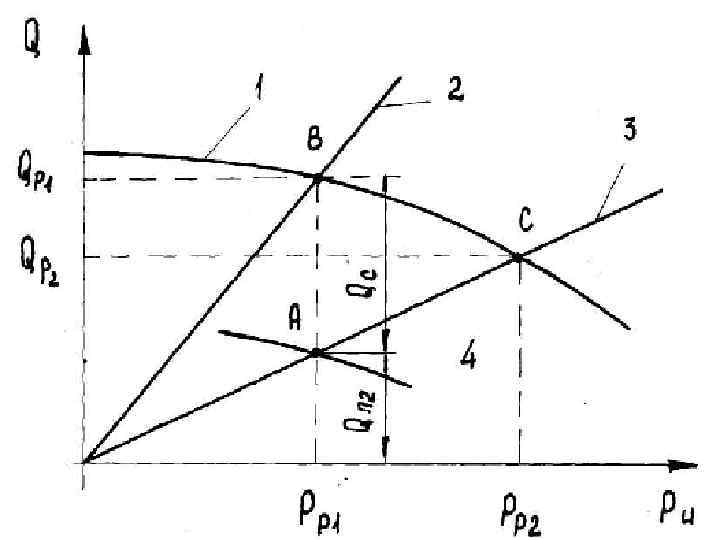 • Процесс изменения рабочего режима называется регулированием. В соответствии с изложенным, регулировать систему можно изменением характеристики сети или изменением характеристики компрессора. В первом случае к сети с n 2 работающими потребителями параллельно подключается сброс. Если необходимо, чтобы давление компрессора оставалось равным рp 1, то после регулирования суммарная характеристика n 2 потребителей плюс сброс должна иметь вид прямой 2. В этом случае n 2 потребителей будут отбирать расход Qn 2, а через сброс в атмосферу будет уходить количество воздуха Qc. При регулировании системы изменением характеристики компрессора необходимое давление рp 1. установится, если новая расходная характеристика машины пройдет через точку А, т. е. примет вид кривой 4.