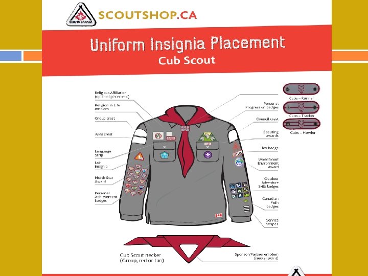 What we expect from you: Regular Meetings Parents to inform Scouters of any absences Cubs to arrive between 7: 15 pm and 7: 30 pm There might not be enough Scouters before 7: 15 pm Late arrivals will not be allowed to join the opening “Grand Howl” Cubs to go to washrooms before meetings Cubs to arrive in full uniform (including name tag, scarf, leather shoes and white socks) Cubs with incomplete uniform will not participate in the opening and closing ceremonies