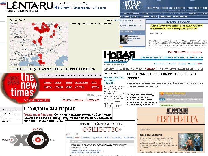 1. Краудсорсинг: Модерация и проверка достоверности поступающих сообщений. 2. Мониторинг различных источников информации (СМИ, блоги, соц. сети) 3. Координация оказания помощи.