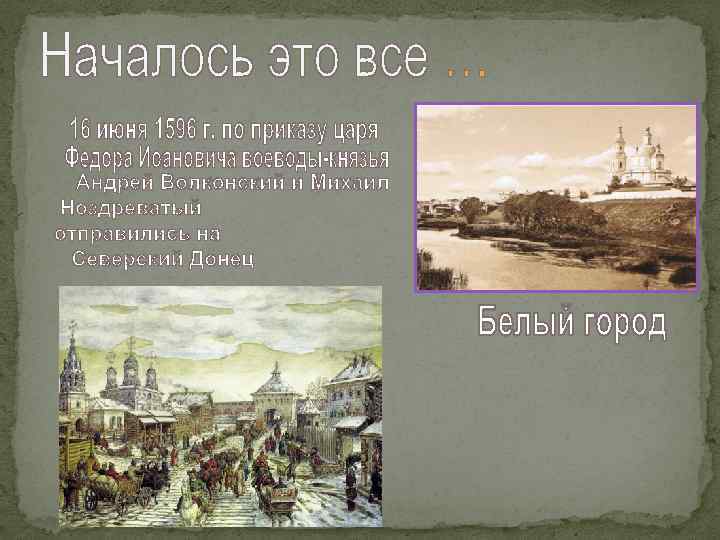 1500 -1510 гг. Северские князья со своими землями переходят под патронаж Москвы из-за притеснения православных в Литве. Белгородский край вошел в состав Московского государства. Северская земля стала называться "польской", т. е. полевой Украиной. 1593 г. По распоряжению царя Федора Ивановича начато строительство крепости "Белгород" вблизи Муравского шляха на меловой горе для защиты южных рубежей Московского государства от крымских татар. Название означало "Светло сделанный, сияющий дом; дом, несущий свет". Летопись сохранила другие названия: Белая Вежа (вежа – шатер, легкое жилище), Белоград, Белогородье. 1596 г. Возобновлено строительство Белгородской крепости на "подготовленном" месте. Город построен князьями Ноздреватым и Волконским. Начало переселений на Белгородчину выходцев из центральных районов Московского княжества и днепровщины.