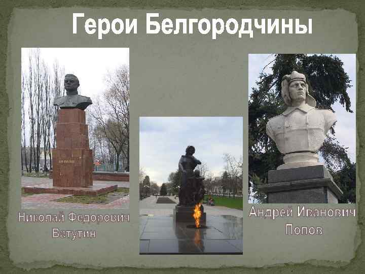 На Белгородчине сохранилось 2016 памятников истории и культуры, 35 из них – федерального значения… Увековечены имена многих знаменитых личностей, прославивших наш край, изготовлены и установлены памятники маршалам И. С. Коневу и Г. К. Жукову. Завершена реставрация многих архитектурных памятников (Смоленского собора в г. Белгороде, здание драматического театра и т. д. ). Восстановлен и открыт для посетителей памятник архитектуры XII в. – подземный монастырь в с. Холки Чернянского района. Сооружены памятники князю Владимиру, святителю Иосафу в г. Белгороде.
