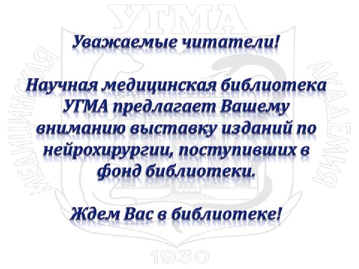 617(УГМА) С 156 Сакович В. П. Современная нейрохирургия (интеграция традиций, опыта и новых технологий) : актовая речь заведующего кафедрой нервных болезней и нейрохирургии профессора Саковича В. П. на итоговой научной конференции УГМА 16 апреля 2008 г. / В. П. Сакович. Екатеринбург : Изд-во УГМА, 2008. - 20 с.