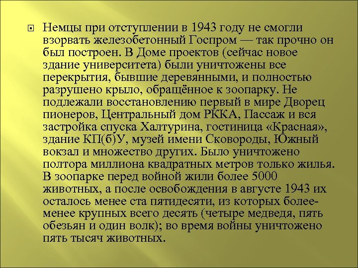 Немцы при отступлении в 1943 году не смогли взорвать железобетонный Госпром — так прочно он был построен. В Доме проектов (сейчас новое здание университета) были уничтожены все перекрытия, бывшие деревянными, и полностью разрушено крыло, обращённое к зоопарку. Не подлежали восстановлению первый в мире Дворец пионеров, Центральный дом РККА, Пассаж и вся застройка спуска Халтурина, гостиница «Красная» , здание КП(б)У, музей имени Сковороды, Южный вокзал и множество других. Было уничтожено полтора миллиона квадратных метров только жилья. В зоопарке перед войной жили более 5000 животных, а после освобождения в августе 1943 их осталось менее ста пятидесяти, из которых болееменее крупных всего десять (четыре медведя, пять обезьян и один волк); во время войны уничтожено пять тысяч животных.