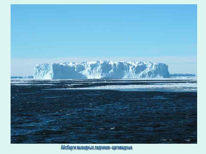 Характернейшей чертой антарктических вод являются айсберги. Они многочисленны у побережья, образуют местами плотные скопления. По морфологическим особенностям айсберги подразделяются на столовые и пирамидальные. Последние наблюдаются сравнительно редко и как правило представляют собой перевернутые или наклоненные столовые айсберги. Поскольку большая часть айсберга находится под водой, он движется не столько под влиянием ветра, дующего в настоящий момент, сколько под влиянием течений, захватывающих значительную толщу воды и обусловленных преобладающими в этом районе ветрами. Для Антарктиды наиболее -характерны столовые айсберги, достигающие в отдельных случаях длинны 170 км, высота над водой до 50 м (иногда более 100 м). Столовые айсберги можно подразделить на несколько основных групп: айсберги шельфовых ледников, собственно столовые, размером 1 км в поперечнике, но могут попадаться и гиганты , до нескольких десятков километров длиной. Поверхность их почти идеально плоская, часто без каких-либо заметных неровностей и трещин. Такие айсберги в верхних частях сложены горизонтальными сдоями льда и фирна , накопившегося на поверхности шельфового ледника.