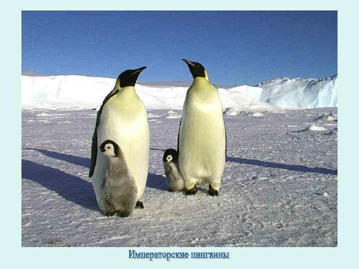 Императорский Пингвины или пингвин Форстера (Aptenodytes forsteri) – достигают длины 115 см и веса 45 кг. Назван этот пингвин в честь Д. Форстера – натуралиста кругосветной экспедиции капитана Д. Кука. Самое суровое время года- зиму- проводят у берегов Антарктиды, а на лето уходят в море. В умеренной зоне его заменяет близкий королевский пингвин который гнездится на разбросанных в Южном океане островах, , королевский помельче чуть меньше 1 м. На боках шеи у обоих видов выделяются оранжевые пятна, имеющие вид больших кавычек. У королевского пингвина оранжевым окрашена и передняя часть шеи. Размножается на льду; единственное яйцо самец держит на лапах, прикрывая кожистой складкой, имеющейся на брюхе; насиживание длится 65 суток. Средний вес яйца 440 г, максимальный 544 г В начале мая начинается кладка яиц, продолжающаяся больше месяца. Выведение птенцов начинается в середине июля. Только с начала кормления птенцов птицы начинают ходить к полынье и обратно нося корм. До этого времени передвижения почти нет, и они живут за счет накопленного в летний период жира. Таким образом, в самую суровую пору, в середине зимы, в мороз и пургу выводятся птенцы. Они почти не имеют пухового покрова и долго не выходят из сумки родителей. Но уже примерно через месяц птенцы обрастают густым пухом и, несмотря на продолжающиеся морозы и метели, свободно бегают по льду. С начала декабря начинается линька птенцов, а затем и взрослых птиц, и с середины декабря начинается распад колоний. Окончательно пингвины уходят в конце января.