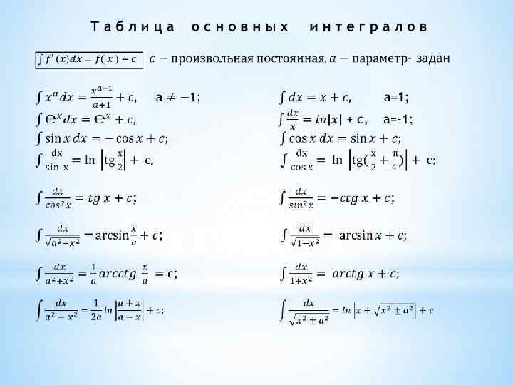 7. 1. Первообразная. Неопределённый и его свойства Функция F(x) называется первообразной функцией функции f(x) на отрезке [a, b], если в любой точке этого отрезка верно равенство: F (x) = f(x). Неопределенным интегралом функции f(x) называется совокупность первообразных функций, которые определены соотношением F(x) + C.