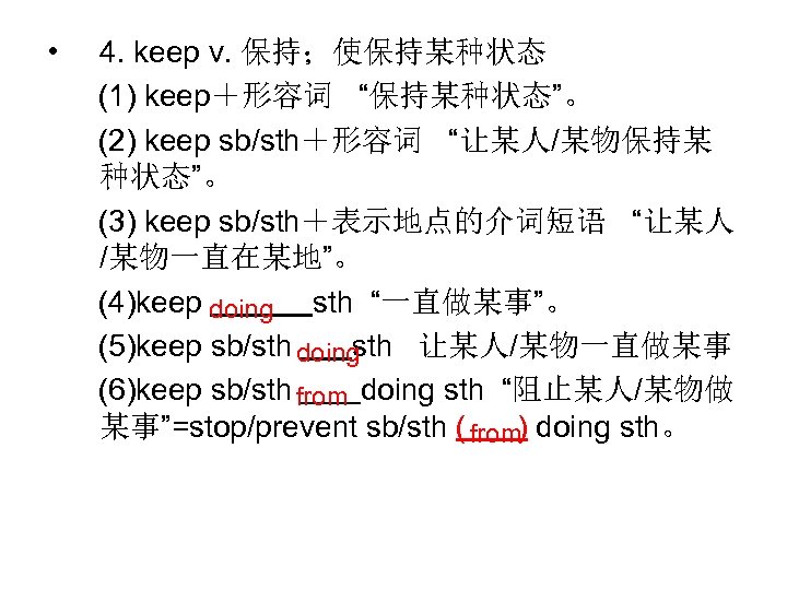 • 4. keep v. 保持;使保持某种状态 (1) keep+形容词 “保持某种状态”。 (2) keep sb/sth+形容词 “让某人/某物保持某 种状态”。 (3) keep sb/sth+表示地点的介词短语 “让某人 /某物一直在某地”。 (4)keep doing sth “一直做某事”。 (5)keep sb/sth doing sth 让某人/某物一直做某事 (6)keep sb/sth from doing sth “阻止某人/某物做 某事”=stop/prevent sb/sth ( from) doing sth。