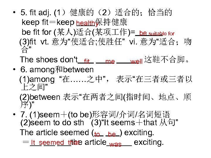• 5. fit adj. (1)健康的(2)适合的;恰当的 keep fit=keep healthy 保持健康 be fit for (某人)适合(某项 作)= be suitable for. (3)fit vt. 意为“使适合; 使胜任” vi. 意为“适合;吻 合” The shoes don't fit. me well 这鞋不合脚。 • 6. among和between (1)among “在……之中”, 表示“在三者或三者以 上之间” (2)between 表示“在两者之间(指时间、地点、顺 序)” • 7. (1)seem+(to be)形容词/介词/名词短语 (2)seem to do sth (3)“It seems+that 从句” The article seemed (to be ) exciting. = It seemed that article was exciting. the