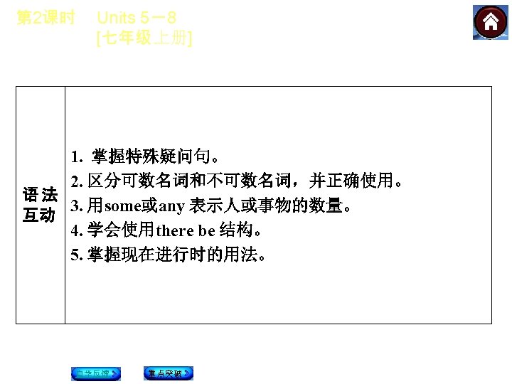 第 2课时 Units 5-8 [七年级 上册] 1. 掌握特殊疑问句。 2. 区分可数名词和不可数名词,并正确使用。 语法 3. 用some或any 表示人或事物的数量。 互动 4. 学会使用there be 结构。 5. 掌握现在进行时的用法。 自学反馈 重点突破