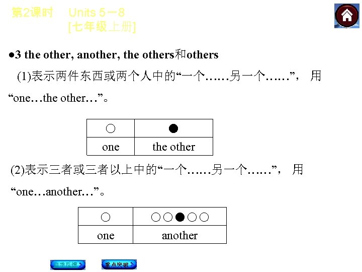 第 2课时 Units 5-8 [七年级 上册] ● 3 the other, another, the others和others (1)表示两件东西或两个人中的“一个……另一个……”, 用 “one…the other…”。 ○ one ● the other (2)表示三者或三者以上中的“一个……另一个……”, 用 “one…another…”。 ○ one 自学反馈 重点突破 ○○●○○ another