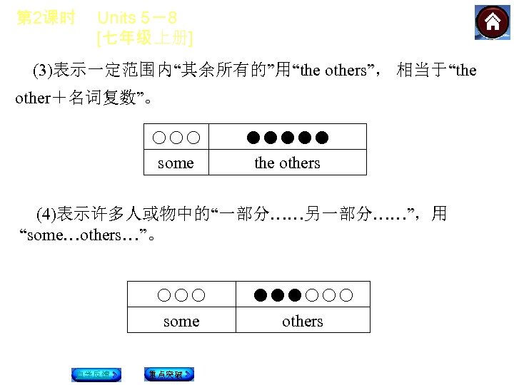 第 2课时 Units 5-8 [七年级 上册] (3)表示一定范围内“其余所有的”用“the others”, 相当于“the other+名词复数”。 ○○○ some ●●●●● the others (4)表示许多人或物中的“一部分……另一部分……”,用 “some…others…”。 ○○○ some 自学反馈 重点突破 ●●●○○○ others