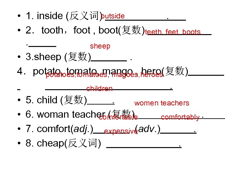 • 1. inside (反义词)outside. • 2.tooth,foot , boot(复数)teeth, feet, boots. sheep • 3. sheep (复数). 4.potato, tomato, mango , hero(复数) potatoes, tomatoes, magoes, heroes. children • 5. child (复数). women teachers • 6. woman teacher (复数) comfortable comfortably. • 7. comfort(adj. ) expensive (adv. ). • 8. cheap(反义词).