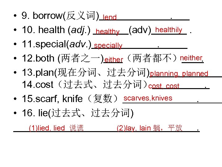 • • • 9. borrow(反义词) lend. 10. health (adj. ) healthy (adv) healthily. 11. special(adv. ) specially. neither. 12. both (两者之一) either(两者都不) 13. plan(现在分词、过去分词) planning, planned. 14. cost(过去式、过去分词) cost, • 15. scarf, knife(复数) scarves, knives. • 16. lie(过去式、过去分词) (1)lied, lied 说谎 (2)lay, lain 躺,平放.