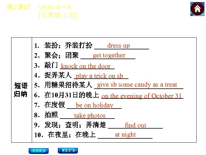 第 2课时 Units 5-8 [七年级 上册] dress up 1. 装扮;乔装打扮 ________ get together 2.聚会;团聚 ________ 3.敲门 ________ knock on the door 4.捉弄某人 ________ play a trick on sb give sb some candy as a treat 短语 5.用糖果招待某人 _____________ 归纳 6.在 10月31日的晚上 ____________ on the evening of October 31 7.在度假 ________ be on holiday 8.拍照 ________ take photos 9.发现;查明;弄清楚 ________ find out at night 10.在夜里;在晚上 ________ 自学反馈 重点突破