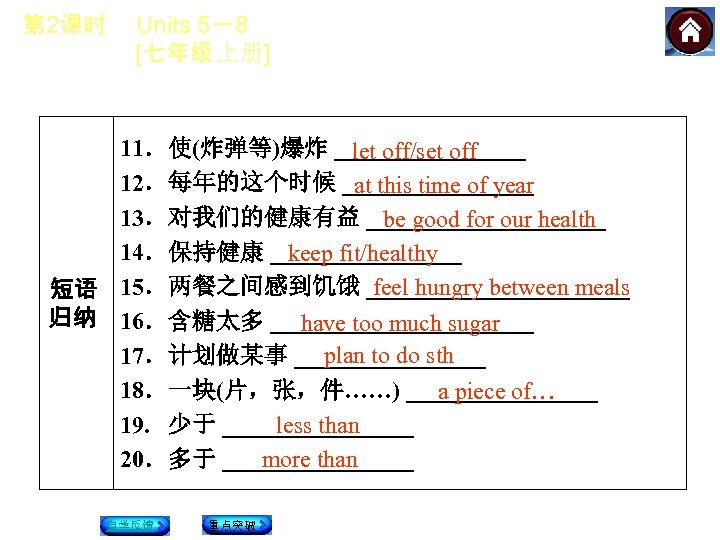 第 2课时 Units 5-8 [七年级 上册] 11.使(炸弹等)爆炸 ________ let off/set off 12.每年的这个时候 ________ at this time of year 13.对我们的健康有益 __________ be good for our health 14.保持健康 ________ keep fit/healthy feel hungry between meals 短语 15.两餐之间感到饥饿 ___________ 归纳 16.含糖太多 ___________ have too much sugar plan to do sth 17.计划做某事 ________ 18.一块(片,张,件……) ________ a piece of… 19. 少于 ________ less than more than 20.多于 ________ 自学反馈 重点突破