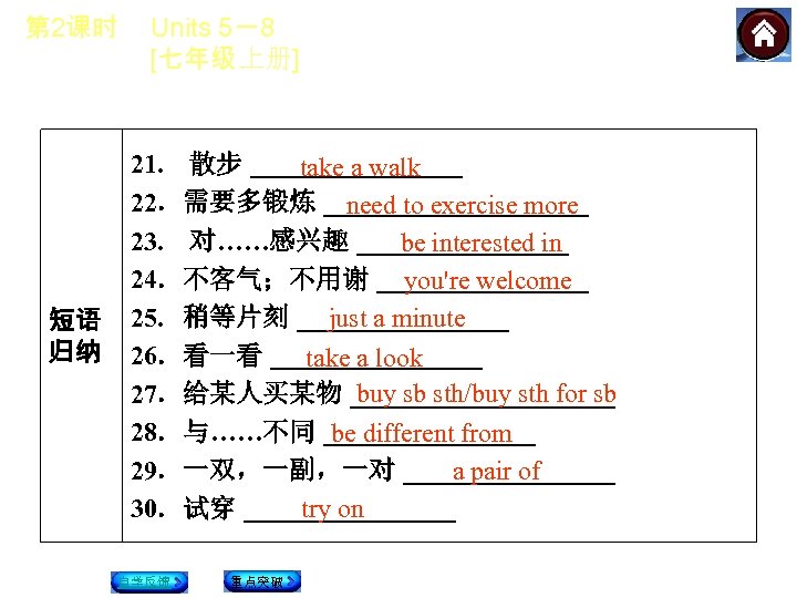 第 2课时 Units 5-8 [七年级 上册] 短语 归纳 21. 散步 ________ take a walk 22.需要多锻炼 __________ need to exercise more 23. 对……感兴趣 ________ be interested in 24.不客气;不用谢 ________ you're welcome 25. 稍等片刻 ________ just a minute 26.看一看 ________ take a look buy sb sth/buy sth for sb 27.给某人买某物 __________ 28.与……不同 ________ be different from 29.一双,一副,一对 ________ a pair of try on 30.试穿 ________ 自学反馈 重点突破