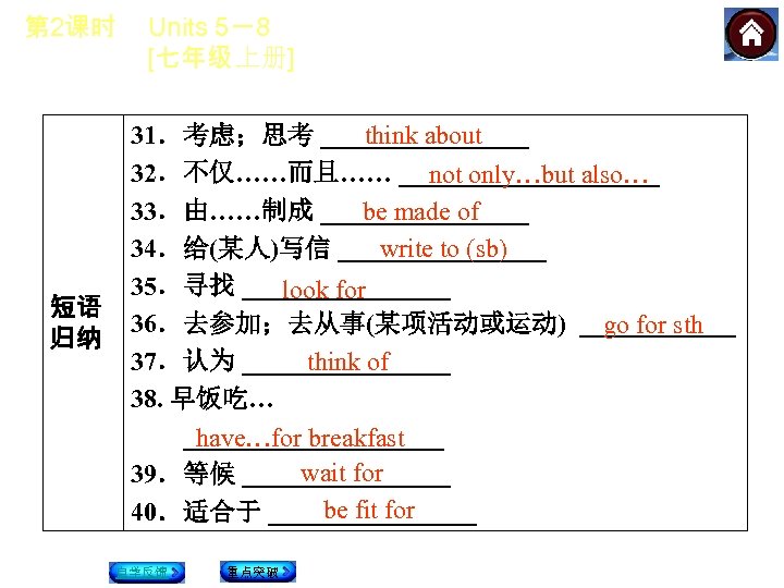 第 2课时 Units 5-8 [七年级 上册] 短语 归纳 think about 31.考虑;思考 ________ 32.不仅……而且…… __________ not only…but also… 33.由……制成 ________ be made of 34.给(某人)写信 ________ write to (sb) 35.寻找 ________ look for 36.去参加;去从事(某项活动或运动) ______ go for sth 37.认为 ________ think of 38. 早饭吃… __________ have…for breakfast wait for 39.等候 ________ be fit for 40.适合于 ________ 自学反馈 重点突破