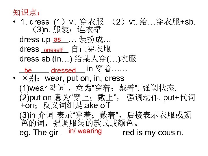 知识点: • 1. dress (1)vi. 穿衣服 (2)vt. 给…穿衣服+sb. (3)n. 服装;连衣裙 dress up as … 装扮成… dress oneself 自己穿衣服 dress sb (in…) 给某人穿(…)衣服 in 穿着…… be dressed • 区别:wear, put on, in, dress (1)wear 动词 ,意为“穿着;戴着”, 强调状态. (2)put on 意为“穿上;戴上”, 强调动作. put+代词 +on;反义词组是take off (3)in 介词 表示“穿着;戴着”,后接表示衣服或颜 色的词,强调服装的款式或颜色。 eg. The girl in/ wearing red is my cousin.