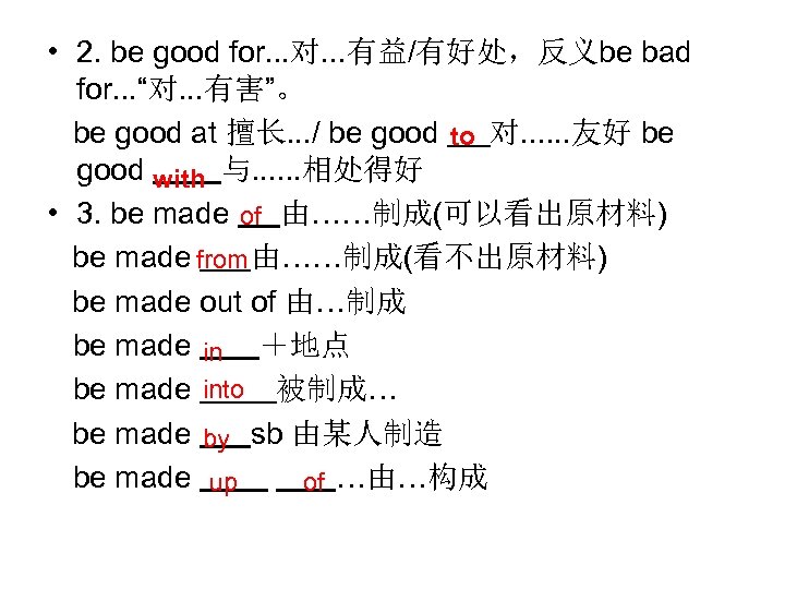 • 2. be good for. . . 对. . . 有益/有好处,反义be bad for. . . “对. . . 有害”。 be good at 擅长. . . / be good to 对. . . 友好 be good with 与. . . 相处得好 • 3. be made of 由……制成(可以看出原材料) be made from 由……制成(看不出原材料) be made out of 由…制成 be made in +地点 be made into 被制成… be made by sb 由某人制造 be made up of …由…构成