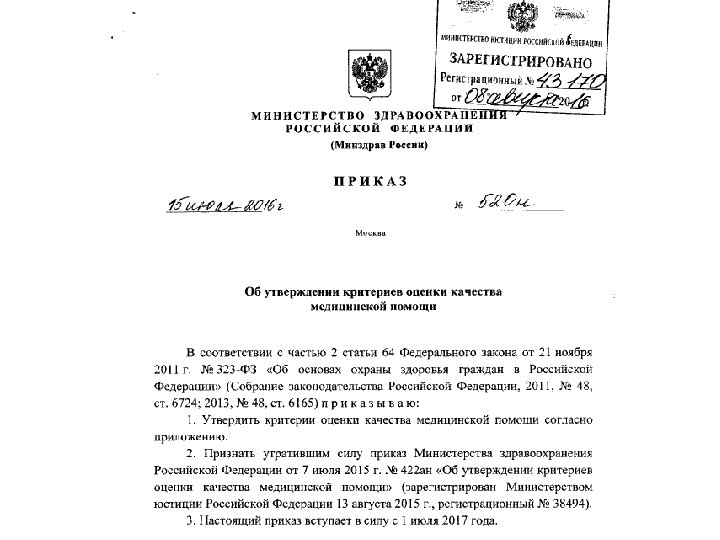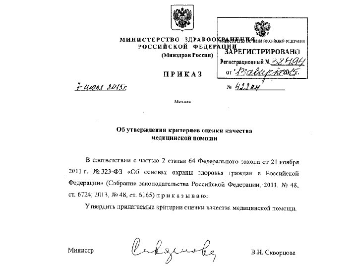 Департамент организации медицинской помощи и санаторно-курортного дела Минздрава России совместно со специалистами разных профилей разработал новый проект приказа «Об утверждении критериев оценки качества медицинской помощи» . 01 июля объявлено начало проведения публичного обсуждения о подготовке проекта нормативного правового акта. Дата окончания публичного обсуждения - 14 июля 2016 г. Планируемый срок вступления в силу - октябрь 2016 г. 10 14