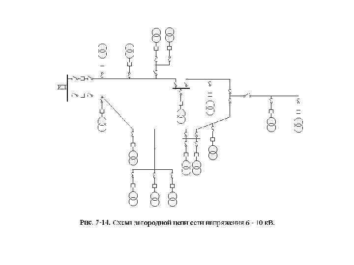• Загородные сети напряжением 6— 10 к. В строят главным образом по радиальным схемам (см. рис. 7 -4), иногда — по радиальным схемам с разомкнутыми перемычками и радиальными ответвлениями. • Разъединители в линиях ставят только на разветвлениях и у наиболее ответственных подстанций, а сами подстанции для нагрузок 3 -й категории выполняют, как правило, однотрансформаторными, по простейшей схеме. Пример схемы такой сети представлен на рис. 7 -14.