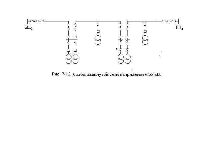 • Для ответственных потребителей 1 -й и 2 -й категорий, например для районов с густым расположением населенных пунктов, с промышленными предприятиями, шахтами, тяговыми подстанциями и т. п. , применяют замкнутые схемы сетей напряжением 35 к. В с выключателями с обеих сторон каждого участка линии. Это позволяет селективно отключать поврежденный участок, сохраняя электроснабжение ответственных подстанций от разных источников питания. Неответственные подстанции можно присоединять к такой схеме на отпайках. Пример схемы подобной замкнутой сети напряжением 35 к. В, получающей питание от разных источников, показан на рис. 7 -15.