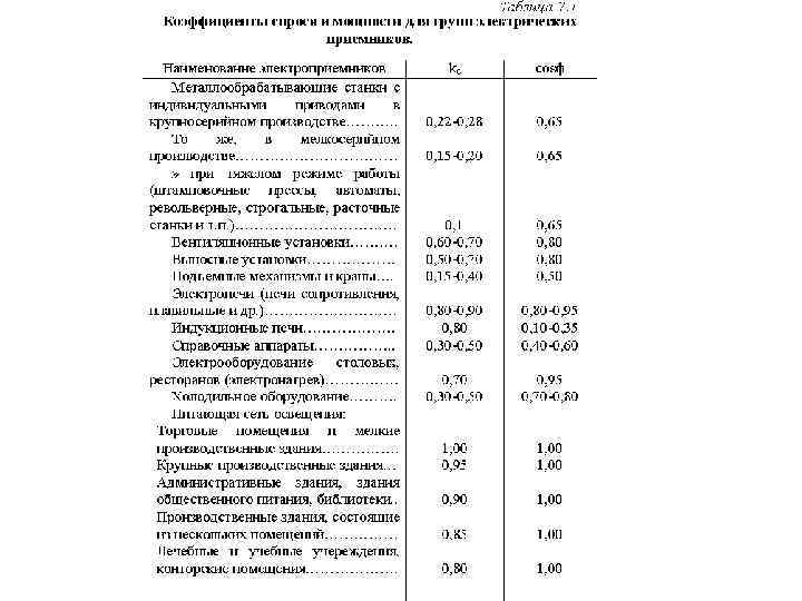 • В табл. 7 -1 указаны также средние значения коэффициентов мощности для каждого вида электроприемников, по которым можно определить расчетную величину реактивной мощности.