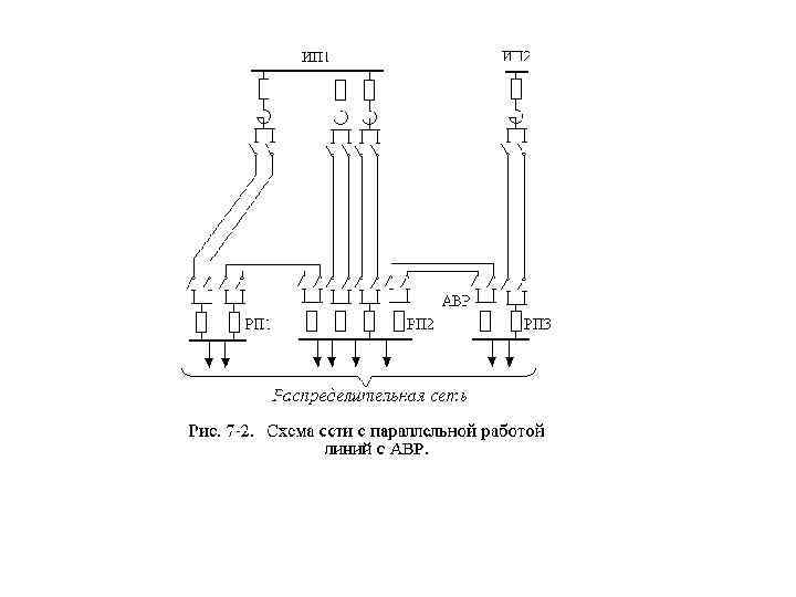 • Если протяженность питательной сети относительно невелика, а нагрузки РП значительны, то схемы, подобные изображенным на рис. 7 -1, выполняются сдвоенными кабелями в каждой линии с АВР на резервных перемычках между РП (рис. 72).