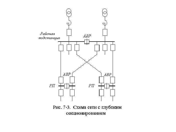 • На районных подстанциях широко применяют секционированные схемы с групповыми и сдвоенными реакторами; но без реакторов на отходящих питательных линиях. В этих случаях питательную сеть строят по принципу глубокого секционирования, устанавливают секционные выключатели, снабженные АВР на РП, и присоединяют питательные линии к разным секциям источника питания (рис. 7 -3).