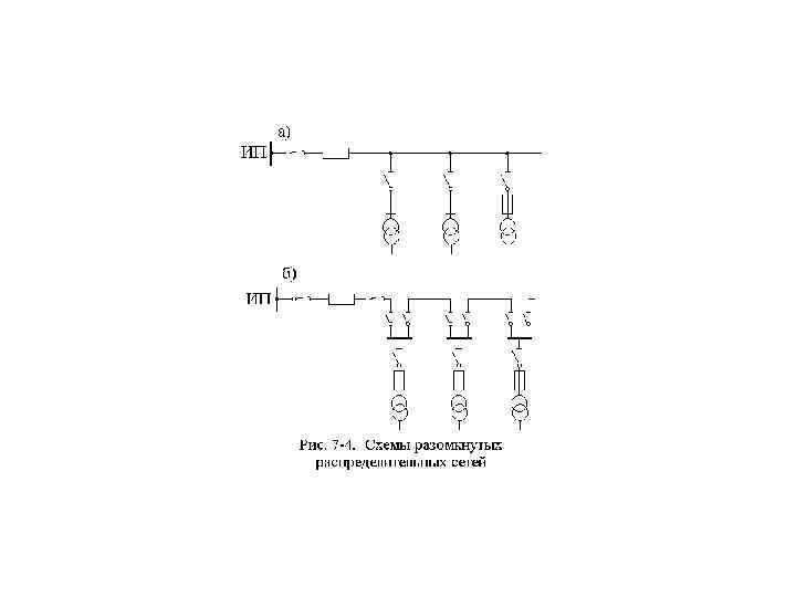 Распределительные сети напряжением 6 — 10 к. В • На рис. 7 -4, а представлена наиболее простая и дешевая схема разомкнутой распределительной сети высокого напряжения для городских и сельских потребителей. Недостатком этой схемы является то, что авария, происшедшая в любом месте сети, прекращает питание всех потребителей.