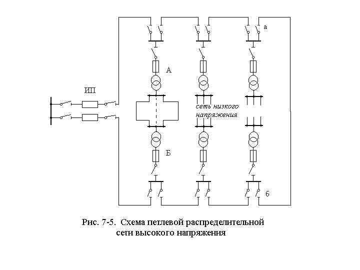 • Петлевая распределительная сеть, представленная на рис. 7 -5, работает разомкнуто (перемычка а—б в конце сети нормально разомкнута); каждая магистральная линия питается от источника питания независимо. Если, повреждается какой-либо участок одной из линий, то от релейной защиты отключается выключатель, установленный в начале линии, и питание всех потребителей, присоединенных к этой линии, нарушается.