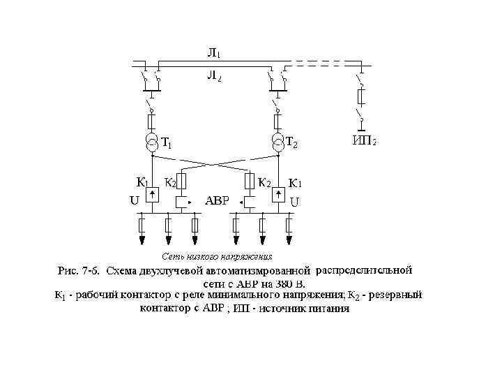 • При аварии в трансформаторе или в линии высокого напряжения сеть низкого напряжения, питающаяся отданного трансформатора, автоматически отключается и переключается на другой трансформатор при помощи контакторов К 1 и К 2.