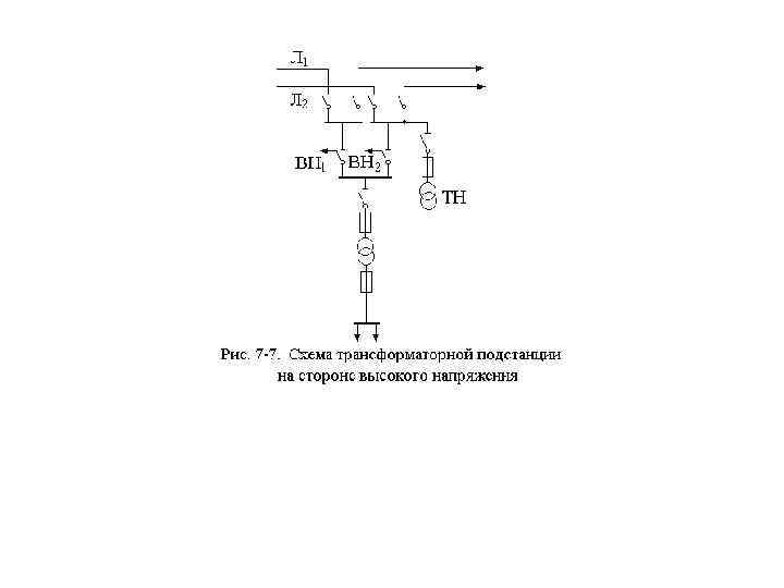 • Высокая надежность трансформаторов делает допустимой и такую двухлучевую схему питания разомкнутых сетей низкого напряжения, по которой на подстанцию приходится только один трансформатор. Резервирование на случай повреждения питающей линии высокого напряжения Л 1 и Л 2 осуществляется здесь на вводах высокого напряжения посредством двух выключателей нагрузки ВН 1 и ВН 2 (рис. 7 -7), один из которых нормально отключен. Исчезновение напряжения приводит к тому, что от реле минимального напряжения подается команда на отключение ВН 1 и на включение ВН 2. Оперативный ток получают от трансформатора напряжения ТН.