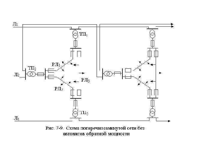 • Поперечнозамкнутая сеть простейшего типа (рис. 7 -9), питаемая от трех магистральных линий высокого напряжения Л 1, Л. 2 и Л 3, представляет собой ряд участков, состоящих из нескольких параллельных распределительных линий PJI низкого напряжения, концы каждой из которых присоединены к двум ТП, в свою очередь питающимся от разных магистралей высокого напряжения. Линии низкого напряжения в такой схеме защищены предохранителями, а со стороны низкого напряжения трансформаторов — автоматами обратной мощности