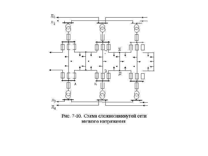 • Сложно замкнутые сети низкого напряжения (их называют также замкнутыми сетками) характеризуются большим количеством линий, питаемых от разных ТП (рис. 7 -10), и внутренними связями (ДЕ), присоединенными к продольным (АБ) и поперечным (ВГ) линиям низкого напряжения.