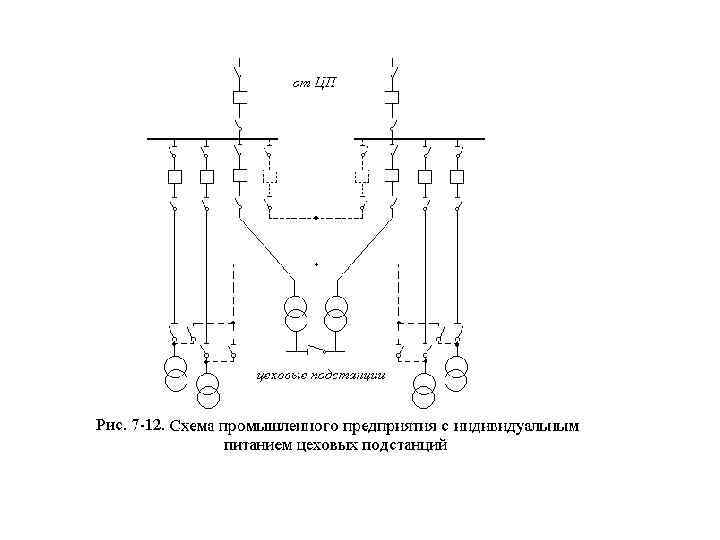 • Для предприятий с нагрузками 1 -й и 2 -й категорий применимы схемы с индивидуальным питанием цеховых подстанций от РП, как это изображено на рис. 7 -12. В этом случае повреждение линии какой -либо цеховой подстанции не сказывается на работе остальных подстанций. Надежность схемы можно повысить, поставив резервирующую перемычку, изображенную на схеме штриховой линией. Но это делает недостаток схемы — повышенный расход кабелей — еще ощутимее.