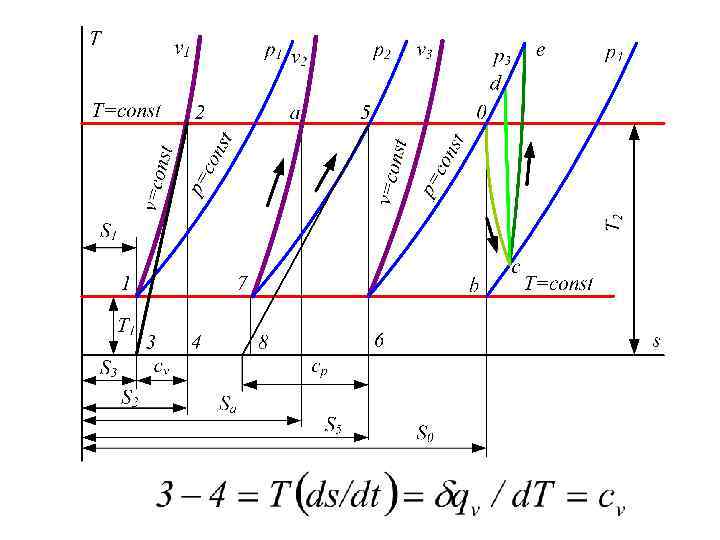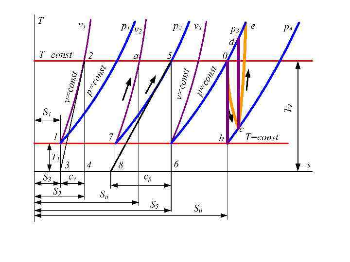 1. ОБЩИЕ ВОПРОСЫ ИССЛЕДОВАНИЯ ПРОЦЕССОВ К основным процессам относятся: • изохорный, протекающий при постоянном объеме v = const; • изобарный, протекающий при постоянном давлении p = const; • изотермический, протекающий при постоянной температуре T = const; • адиабатный, протекающий при отсутствии теплообмена с внешней средой S = const; • политропные, характеризующиеся постоянством теплоемкости в процессе cx = const.