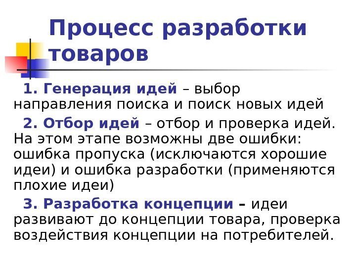 Процесс разработки товаров 1. Генерация идей – выбор направления поиска и поиск новых идей 2. Отбор идей – отбор и проверка идей. На этом этапе возможны две ошибки: ошибка пропуска (исключаются хорошие идеи) и ошибка разработки (применяются плохие идеи) 3. Разработка концепции – идеи развивают до концепции товара, проверка воздействия концепции на потребителей.
