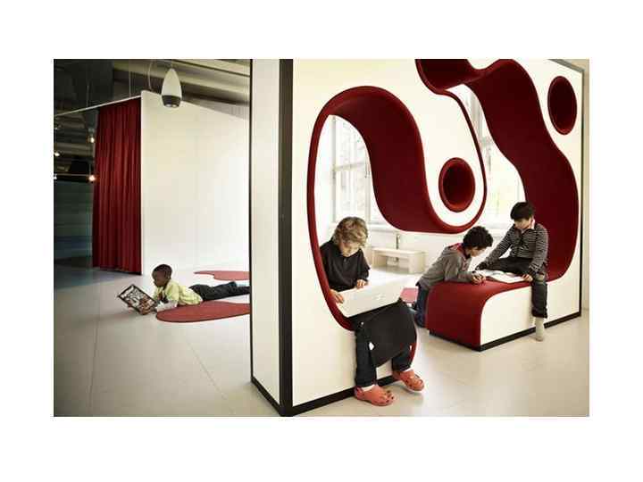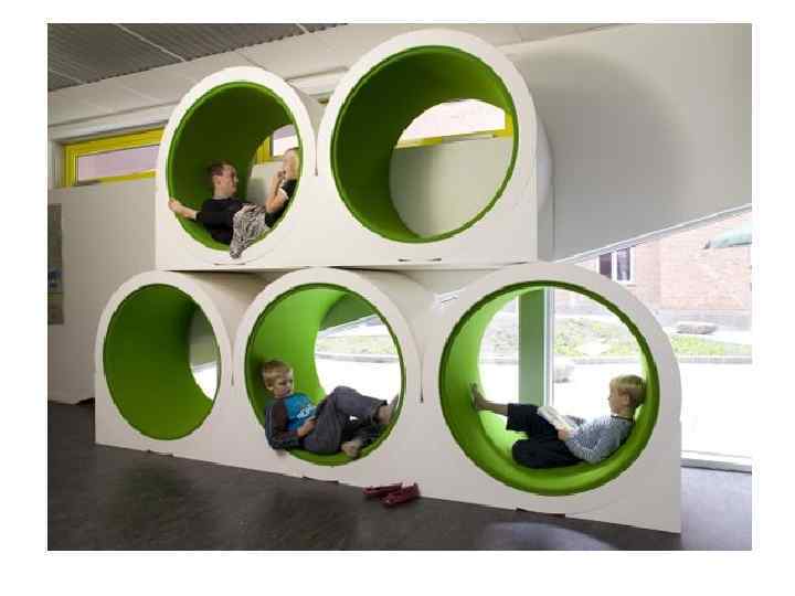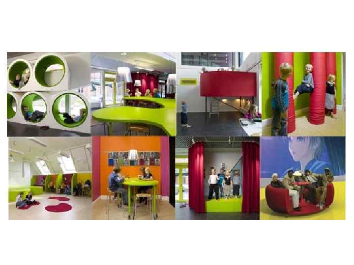 Экспериментальная школа в Стокгольме. Нет привычных классов со столами и стульями. Пространство насыщенно интерьерными объектами органической формы – «Ледяная горка» , «Деревья» , «Пещера» , «Остров» .