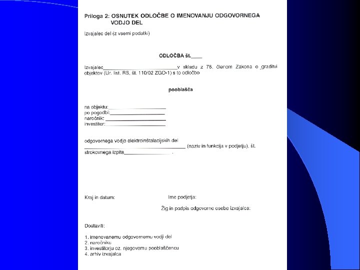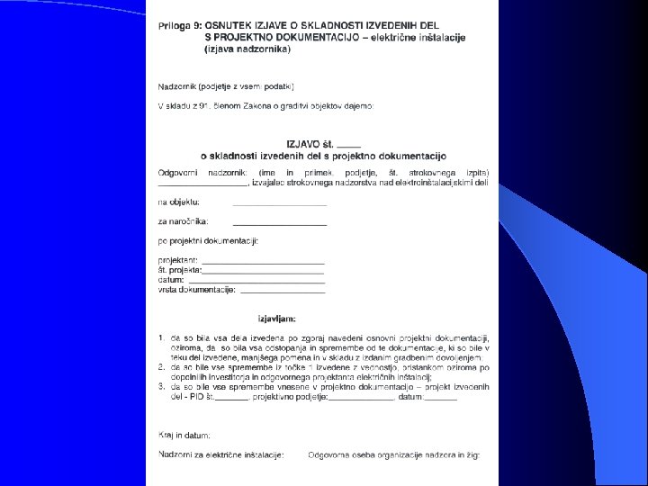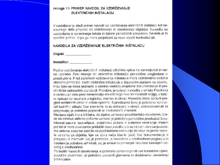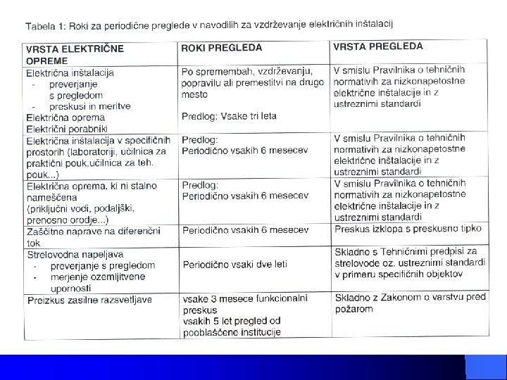 a) preverjanje s pregledom vseh razdelilno - stikalnih mest pri izklopljenem stanju električne instalacije, pri čemer je poseben poudarek na preverjanju: - zaščite pred električnim udarom s pomočjo okrovov, pregrad in postavitvijo opreme zunaj dosega rok (zaščita zbiralk, priključno spojnih mest); - izbire in nastavitve zaščitnih naprav (zaščitna motorska stikala, bimetalni releji) - prepoznavanja nevtralnega (mo) in zaščitnega vodnika (ru/ze) - prepoznavanje tokokrogov, varovalk, stikal, sponk in druge opreme - povezave vodnikov; standardni električni razvod je v električnih napravah in strojih največkrat instaliran po TN-C-S sistemu, v samih običajih stanovanjskih in gospodarskih objektih pa največkrat srečamo TN in TT napajalni sistem.