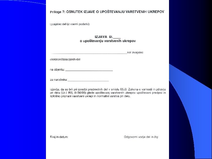 IT sistem Vizuelni pregled obsega preverjanje: - zahtev, podanih v splošnih vizuelnih pregledih (točka 8. 1. ) in za TN sistem - da niso prevodni deli naprav neposredno ozemljeni - da niso prevodni deli povezani z zaščitnim vodnikom Preizkusi in meritve: - zahteve, podane v splošnih preizkusih (točka 8. 1. ) - meritev se izvede s simulacijo okvare, če obstaja sum ali če niso znani parametri za izračun toka prve okvare - odvisno od IT sistema (ali se vodi nevtralni vodnik) izvedemo meritev kot pri TN oziroma TT sistemu - meritev faznih in medfaznih napetosti