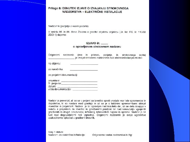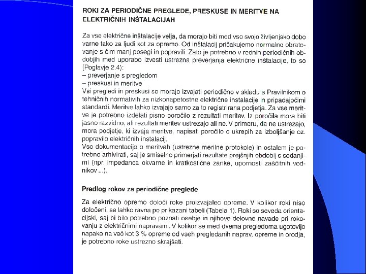 8. PREGLED IN PREIZKUS NIZKONAPETOSTNIH INSTALACIJ Vsaka električna instalacija mora biti med izvajanjem in - ali ko je končana, vendar še pred izročitvijo uporabniku, pregledana in preizkušena v skladu s Pravilnikom o tehničnih normativih za nizkonapetostne instalacije. Ta zahteva velja za nove in za obnovljene instalacije. Občasno opravljamo preglede tudi med obratovanjem (periodični pregledi) v smislu splošnih zahtev oziroma internih pravilnikov. Osnovni postopek verifikacije električne instalacije prostora ali naprave je potrebno realizirati pred funkcionalnim preizkusom naprave ali predajo naprave oz. objekta uporabniku. S preizkusi in meritvami moramo preveriti predvsem tiste elemente, ki služijo varnosti. Rezultate preizkusov in meritev moramo dokumentirati in jih predložiti uporabniku merjenega objekta