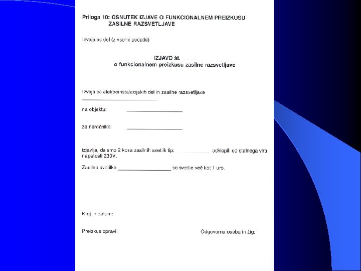 8. 2. 1 MALA NAPETOST Vizuelni pregled obsega preverjanje: - pravilnost izbire vira energije pravilnost izbire vtičnic in vtikačev (po obliki) - ločenost (da ali ne) zaščitnega vodnika od izpostavljenih prevodnih delov - ločenost položitve vodnikov male napetosti od drugih tokokrogov Preizkusi in meritve: - če je vrednost napetosti višja od 25 V AC oziroma 60 V DC, je potrebno zagotoviti zaščito pred direktnim dotikom s pregradami oziroma ohišji z minimalno stopnjo zaščite IP 2 x ali pa z izolacijo, ki vzdrži preizkusno napetost 500 V (1500 V) efektivne vrednosti AC v času trajanja 1 minute - izmeriti velikost U< 25 V (ali 50 V) za AC in U< 60 V (ali 120 V) za DC - izmeriti upornost vodnikov proti zemlji, pri čemer je potrebno dokazati, da so prevodni deli povezani z zaščitnim vodnikom oziroma glavno zbiralko za izravnavo potenciala - izmeriti izolacijsko upornost vodnikov