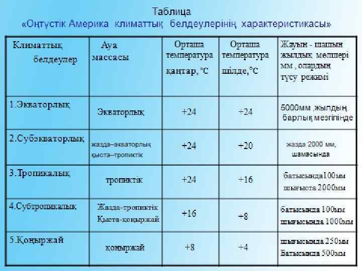 Таблица «Оңтүстік Америка климаттық белдеулерінің характеристикасы» Климаттық белдеулер 1. Экваторлық 2. Субэкваторлық 3. Тропикалық 4. Субтропикалық 5. Қоңыржай Ауа массасы Орташа температура қаңтар, °С шілде, °С Жауын - шашын жылдық мөлшері мм , олардың түсу режимі