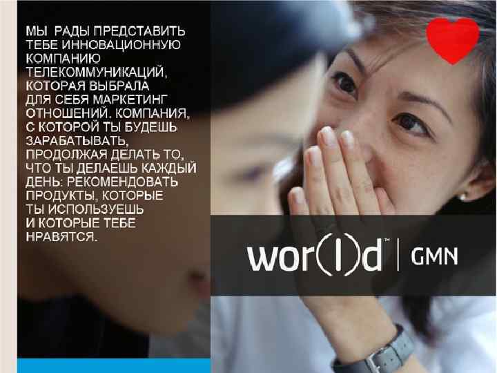 WOR(I)D GMN РАСПРЕДЕЛЯЕТ 50% ОТ ВСЕХ ПРОДАЖ НЕПОСРЕДСТВЕННО СТРУКТУРЕ, ЛЮДЯМ, КОТОРЫЕ ПРОДВИГАЮТ НАШИ ПРОДУКТЫ. WOR(I)D GMN ВКЛАДЫВАЕТ В ТЕБЯ И ТВОЮ ОРГАНИЗАЦИЮ ВМЕСТО ТОГО, ЧТОБЫ ВКЛАДЫВАТЬ ЭТИ ДЕНЬГИ В ТРАДИЦИОННУЮ РЕКЛАМУ. Это и есть маркетинг отношений