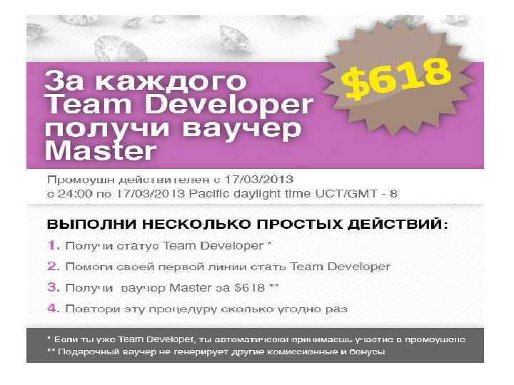 8. Автомобильный бонус • Team Developer • Ранг «Платина» 4 недели подряд • Бонус 1000 $ в месяц Утвердите Ваш успех и купите автомобиль марки BMW !!!