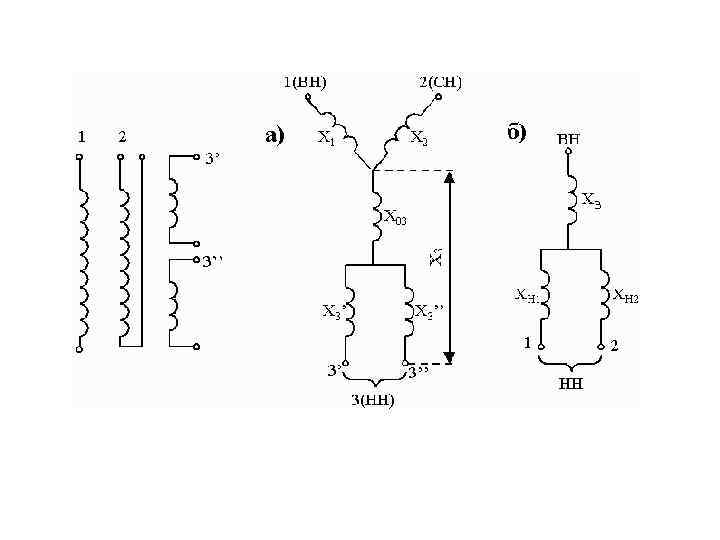 • В повысительных трансформаторах обмотка НН расположена между обмотками ВН и СН и, следовательно, Х 3 = 0. Поэтому эквивалентное сопротивление ветвей расщепленной обмотки будет определяться только сопротивлениями между выводами обмоток ВН—НН и СН—НН, т. е. параллельно включенными сопротивлениями X 1 -3 и Х 2 -3: • а сопротивление каждой из ветвей: