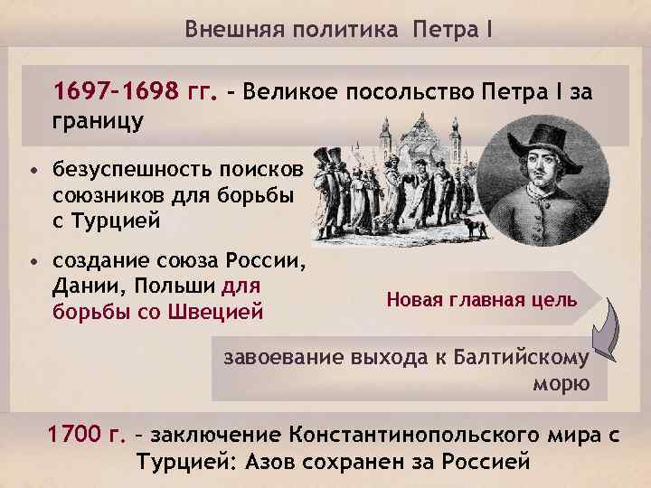 Внешняя политика Петра I 1697 -1698 гг. – Великое посольство Петра I за границу • безуспешность поисков союзников для борьбы с Турцией • создание союза России, Дании, Польши для борьбы со Швецией Новая главная цель завоевание выхода к Балтийскому морю 1700 г. – заключение Константинопольского мира с Турцией: Азов сохранен за Россией