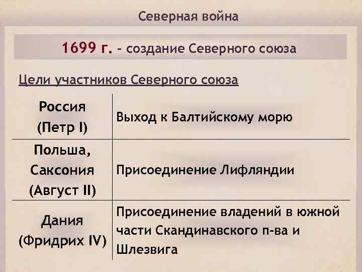 Северная война 1699 г. – создание Северного союза Цели участников Северного союза Россия (Петр I) Выход к Балтийскому морю Польша, Саксония (Август II) Присоединение Лифляндии Присоединение владений в южной Дания части Скандинавского п-ва и (Фридрих IV) Шлезвига